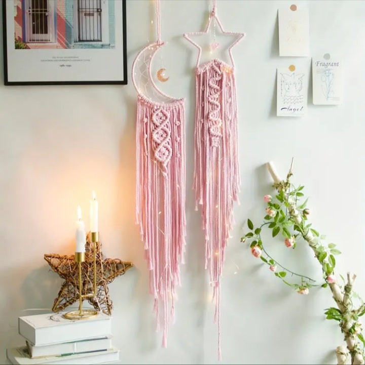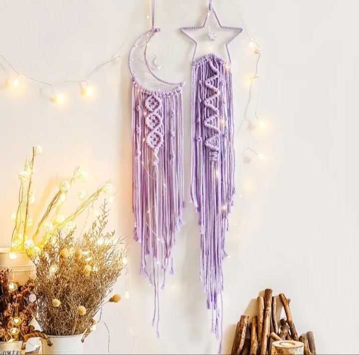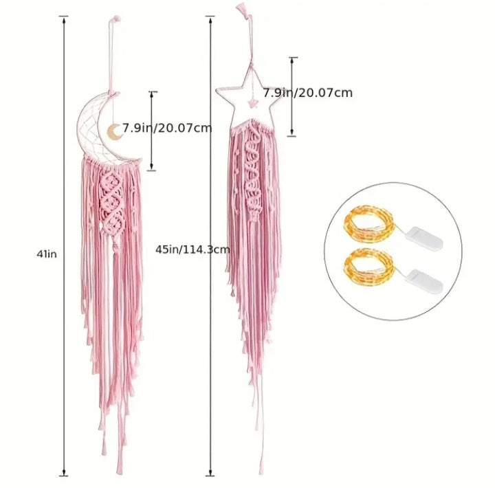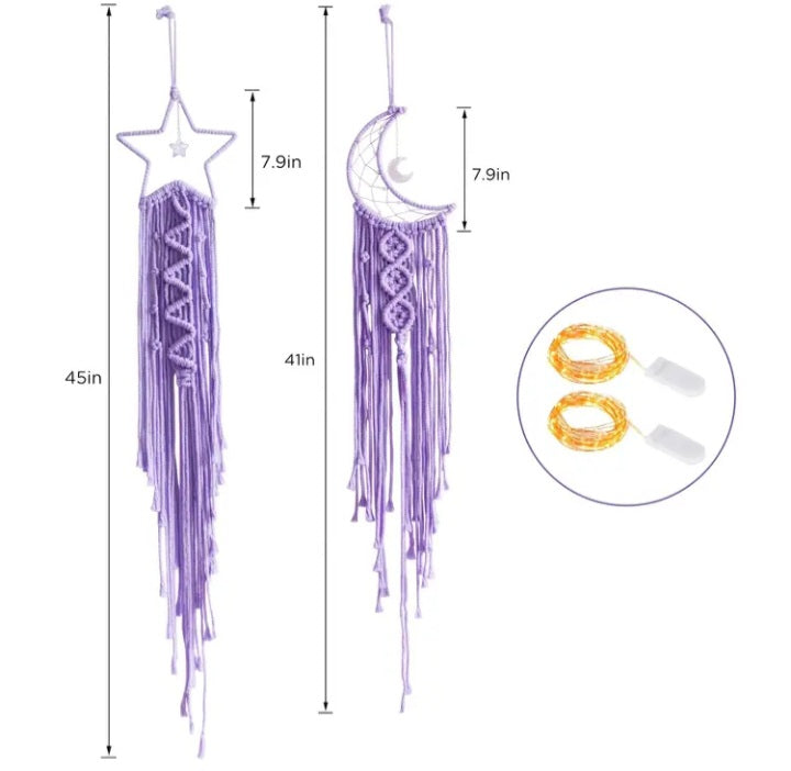 Cet ensemble de capteurs de rêve en tissu comprend une lune et une étoile, ainsi qu'un jeu de lumières à piles pour une ambiance onirique.