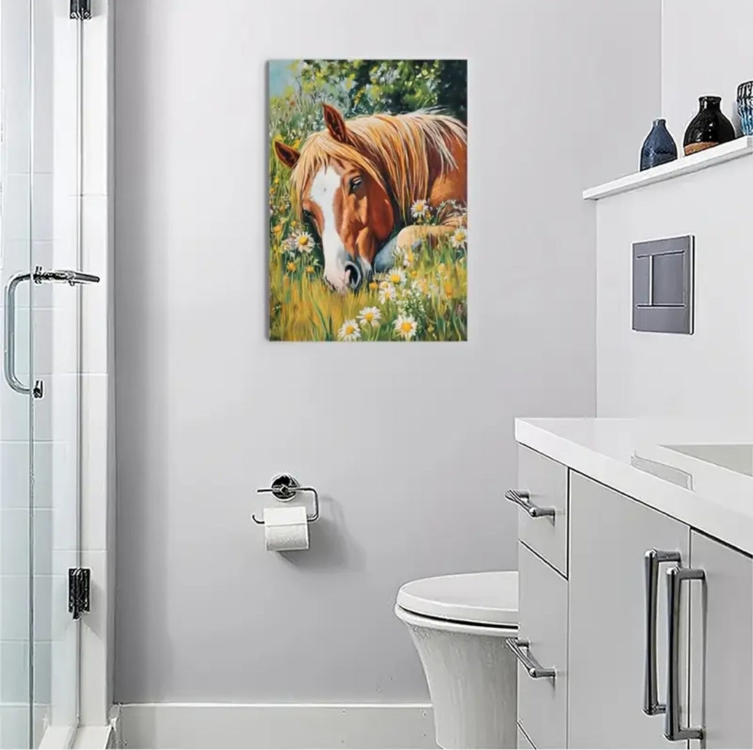 Cette toile encadrée rustique de 30 par 40 cm met en valeur une impression magnifique d'un cheval majestueux.